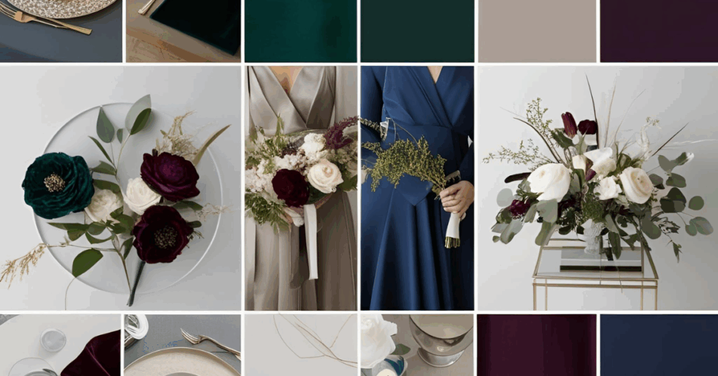Say goodbye to the typical burgundy-and-blush combos! Fall 2025 wedding colors are leaning into deep jewel tones like emerald green, sapphire blue, and rich plum—balanced with minimalist neutrals like taupe, ivory, and soft gray. Brides are mixing textures—think velvet table runners with sleek modern décor—for that perfect balance of cozy and chic.